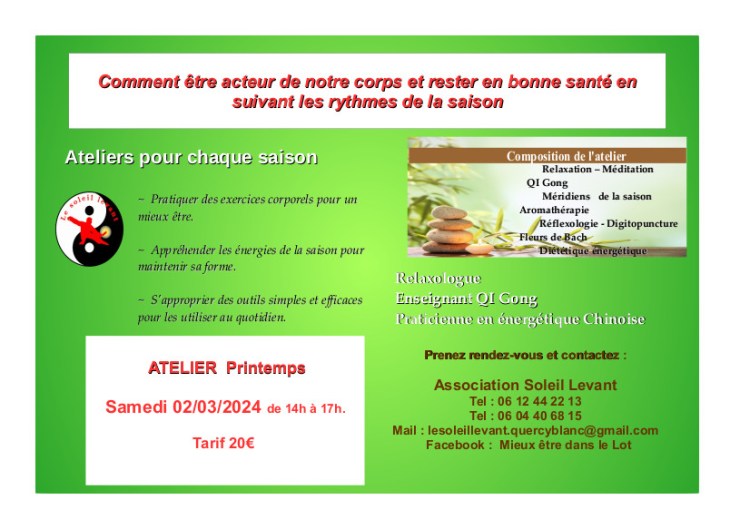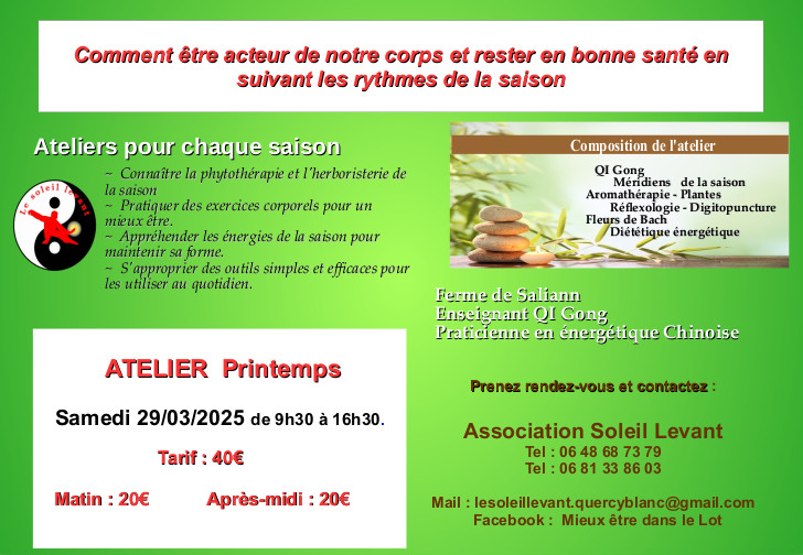 Un atelier mensuel est organisé à chaque saison par le chalet du bien-être. N’hésitez pas à suivre les actus du site et de la page Facebook « Chalet du mieux-être dans le Lot » pour connaître les prochains rendez-vous.